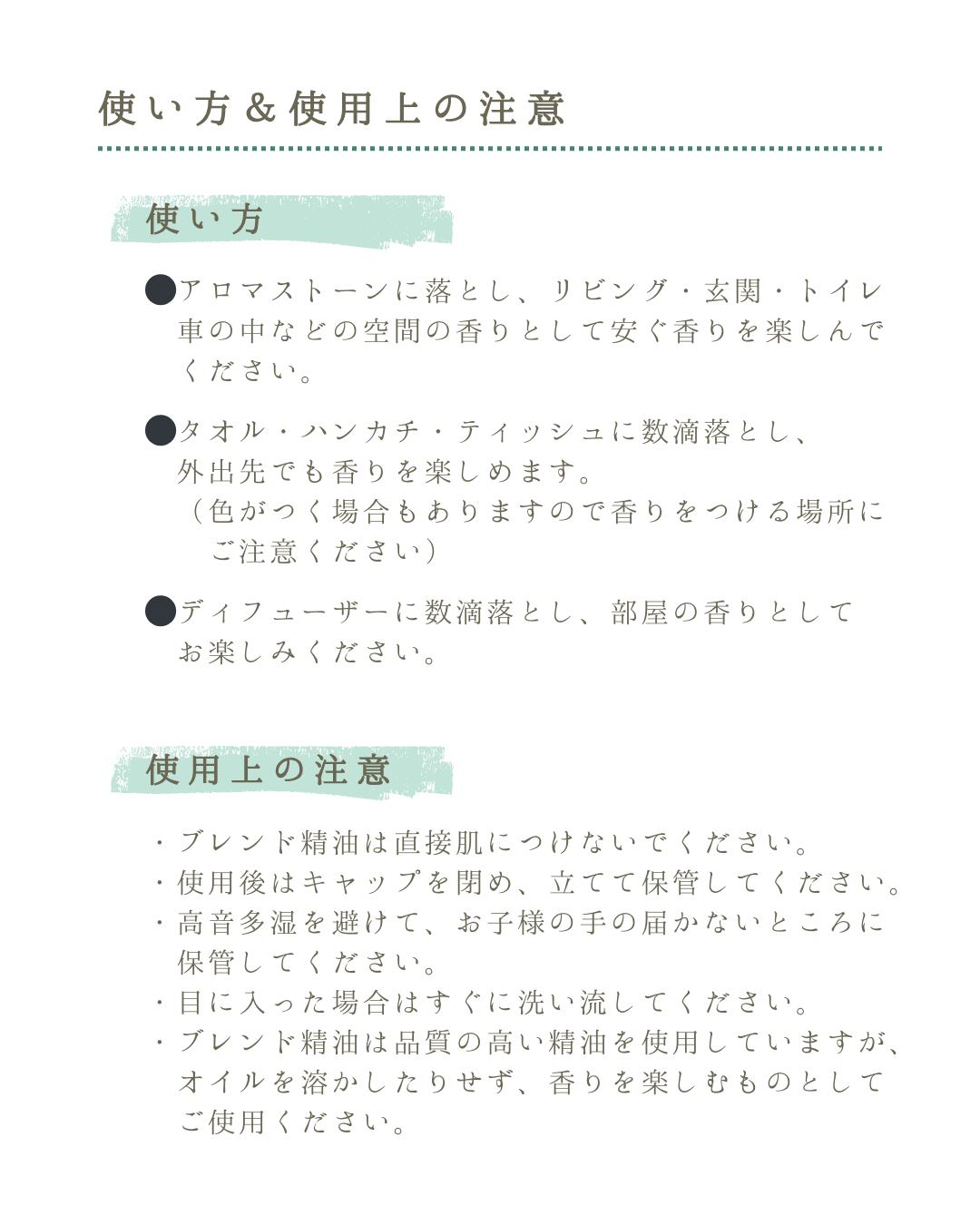 ・ブレンド精油は品質の高い精油を使用していますが、オイルを溶かしたりせず、香りを楽しむものとしてご使用ください。